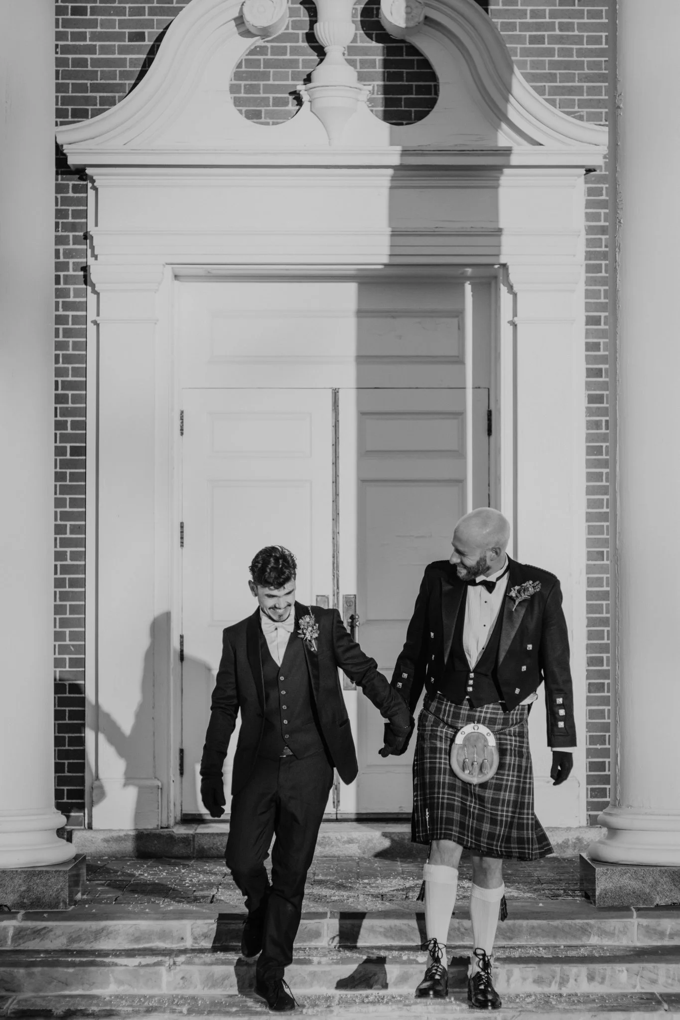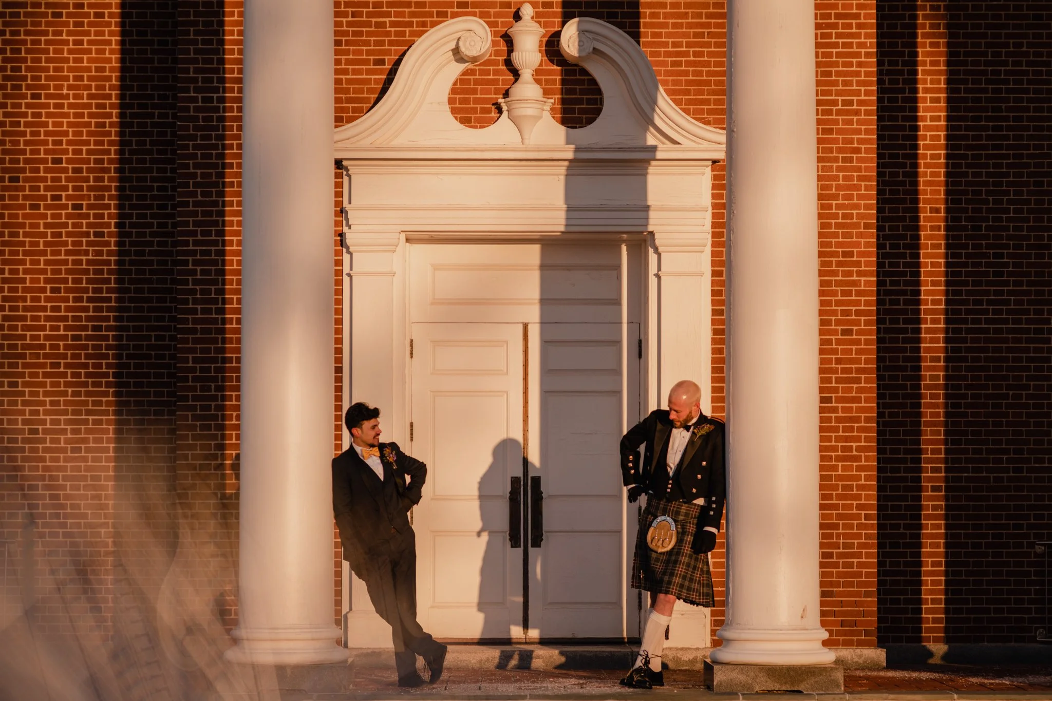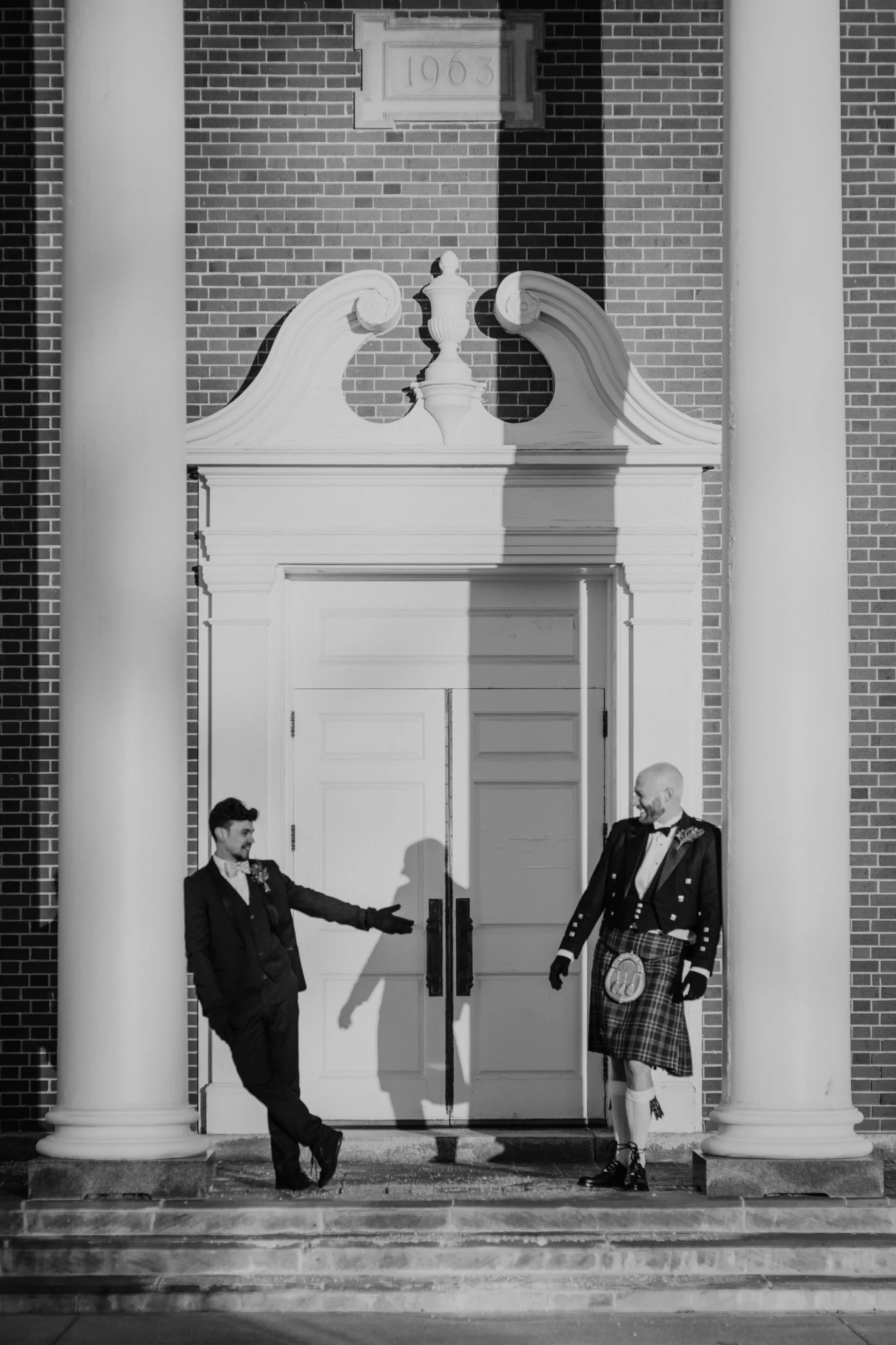 As soon as the vows were done and paperwork was signed, the guests went back to the Wolfville Wedding Chapel to warm up while the happy couple and I managed to brave it in the cold for a few extra moments to capture some portraits at the ceremony site. On our drive back to the wedding chapel, the most beautiful golden hour light blessed us, so stopping at Acadia University for a few more portraits was a must.